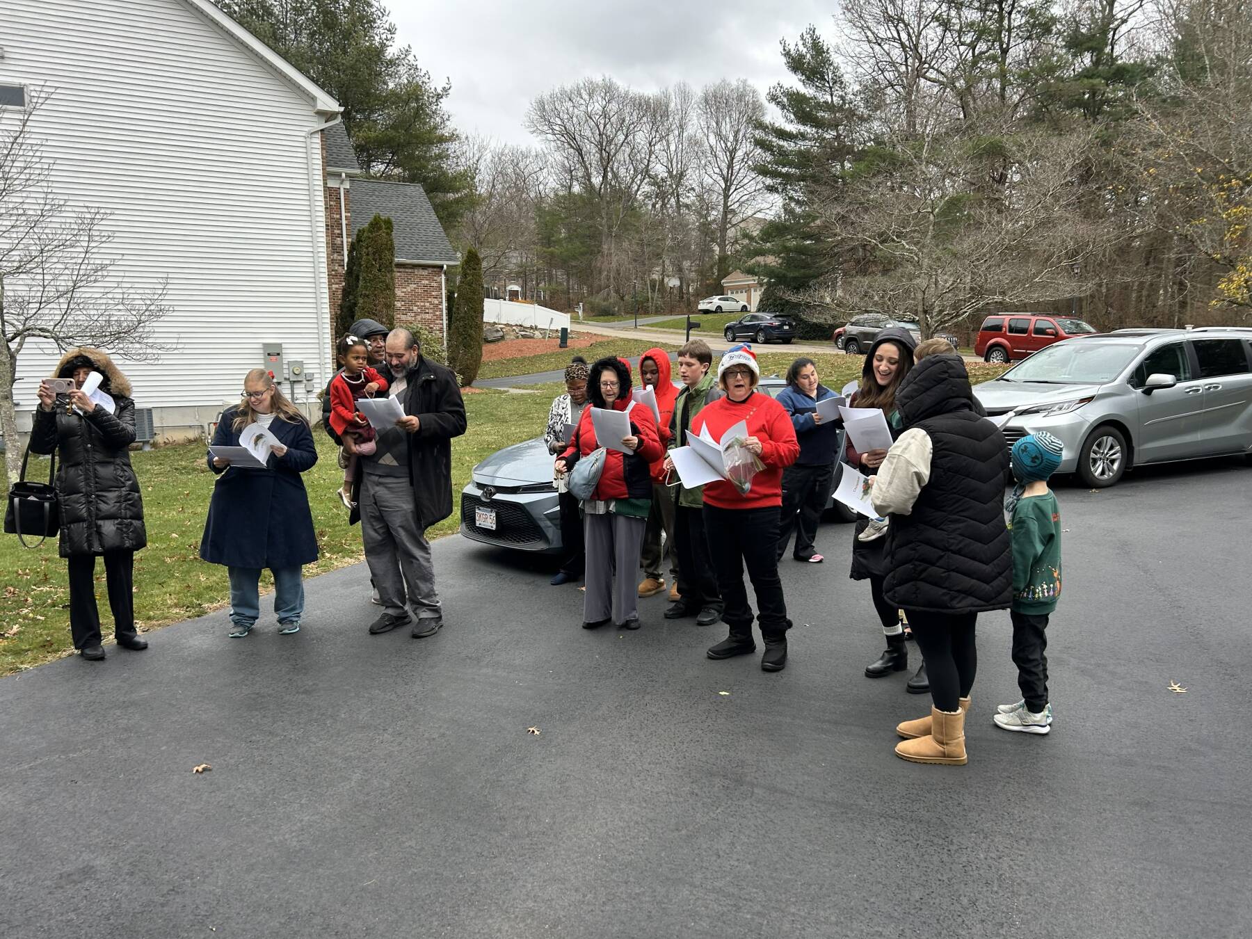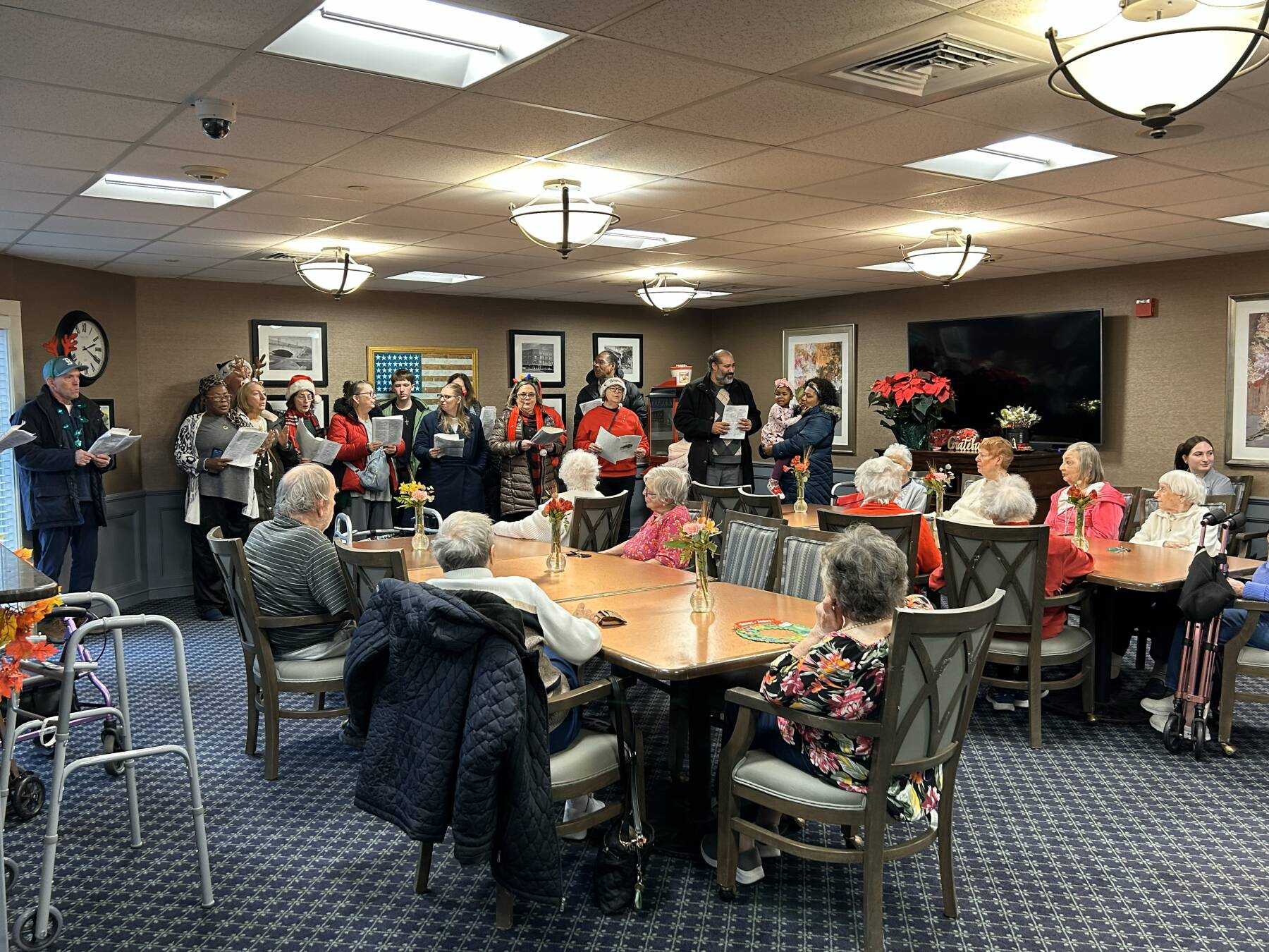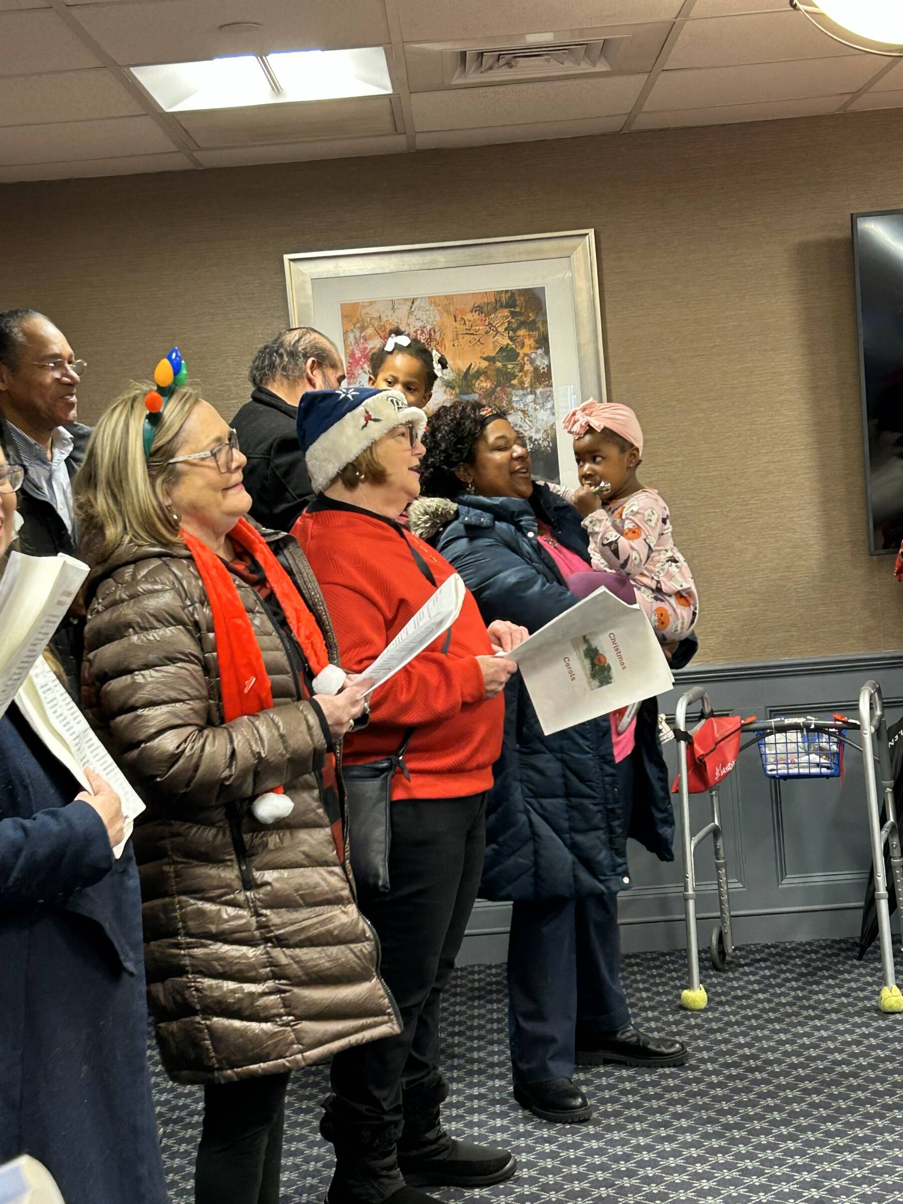 November 30, 2025: Christmas Carolers spreading Christmas cheer! We had the largest group ever with 31 carolers! Our carols were enjoyed by Margie Bynoe in Sharon, Sue Layton in Norton, and Marilyn Carroll and the other residents of Christopher Heights in Attleboro.